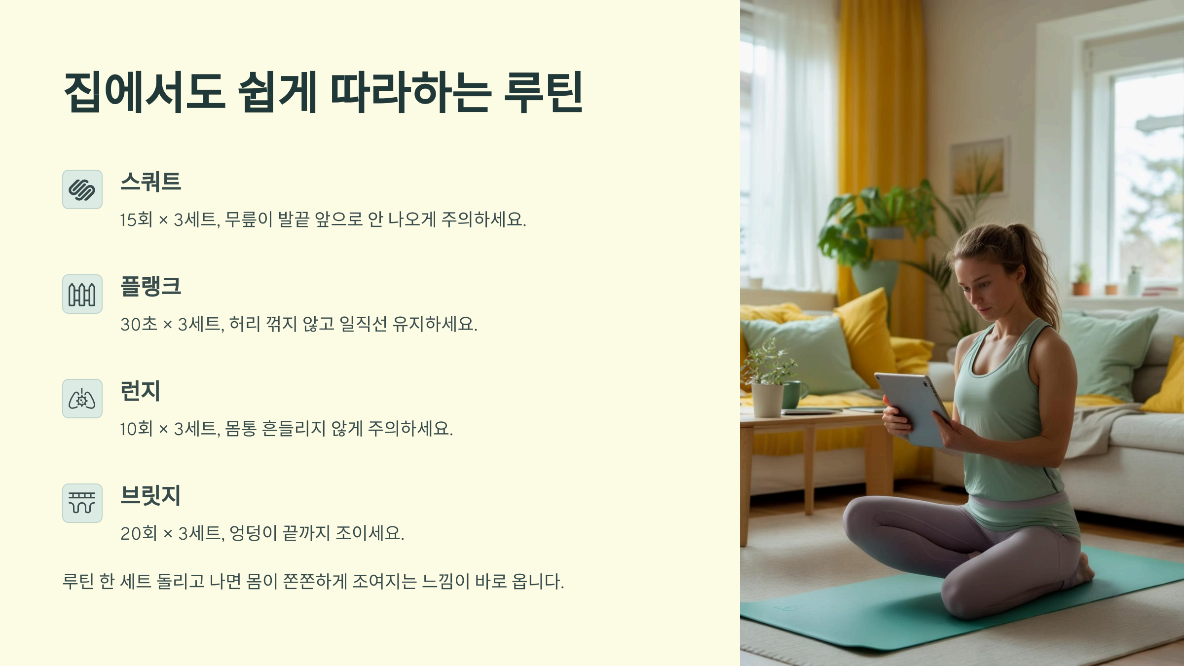 당연하죠~ 초보분들을 위해 루틴도 진짜 초간단하게 짰어요!😊 몸풀기부터 천천히, 정확하게 따라하시면 됩니다